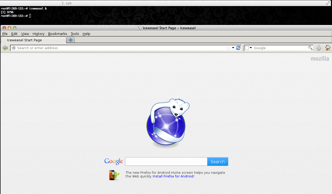 Now, let’s try something a bit bigger. Iceweasel is the name given to Debian’s version of Mozilla’s Firefox browser. The following commands will install and launch Iceweasel from your Linode: