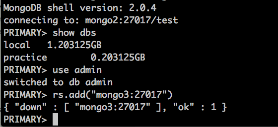 rs1:PRIMARY> rs.add("mongo2:27017") { "ok" : 1 }