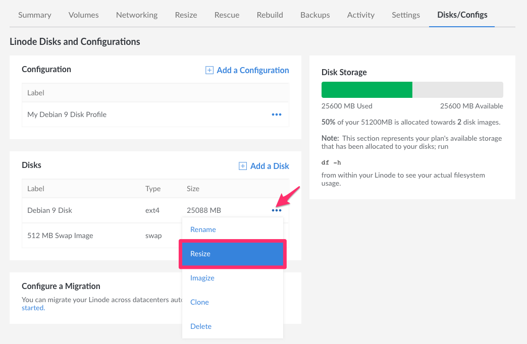 Navigate to your Linode’s Disks/Config tab to view your disk storage allocation meter. Click on the More Options Ellipses link (…) next to the disk you’d like to allocate the extra storage to and select Resize.