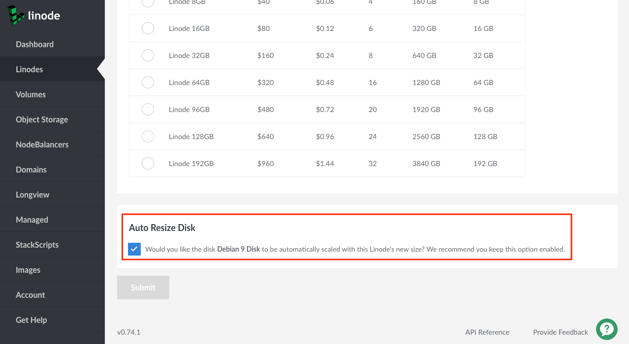 Automatic resizing is only available when moving to a larger plan, and when you have a single ext disk (or one ext and one swap disk) on your Linode.Select a plan and click the Submit button. Your Linode will be powered off and moved to another host. Depending on the size of your Linode, this process can take up to one hour.