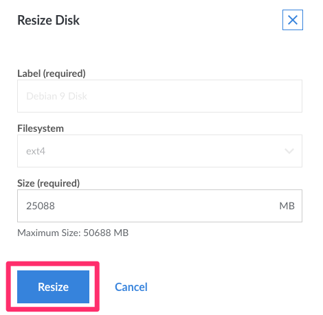 The Resize Disk panel will appear. In the Size field, enter a new size in the specified range and click Resize.