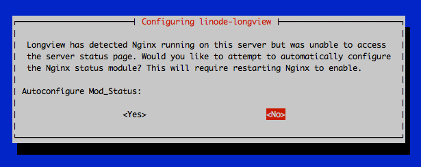 <Yes>: the Longview tool will attempt to enable the status module, set the status page location in a new vhost configuration file, and restart NGINX. This option is easier, but has the potential to disrupt your current NGINX configuration. If you choose yes, and the configuration is successful, you should see output similar to the following: