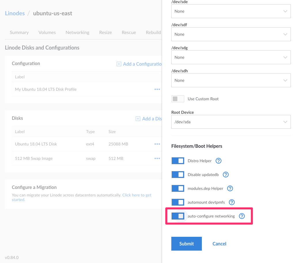 A menu will appear with that configuration profile’s settings. Under the Filesystem/Boot Helpers section, toggle the Auto-configure networking switch to the desired setting; blue is enabled, gray is disabled.
