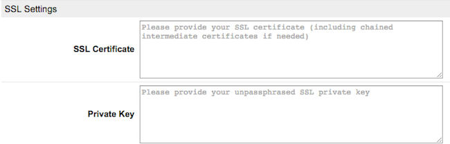 Copy the contents of your SSL certificate into the Certificate field. If you have linked multiple segments of a chained certificate, be sure to copy all of its contents into the text field, appearing one after another.