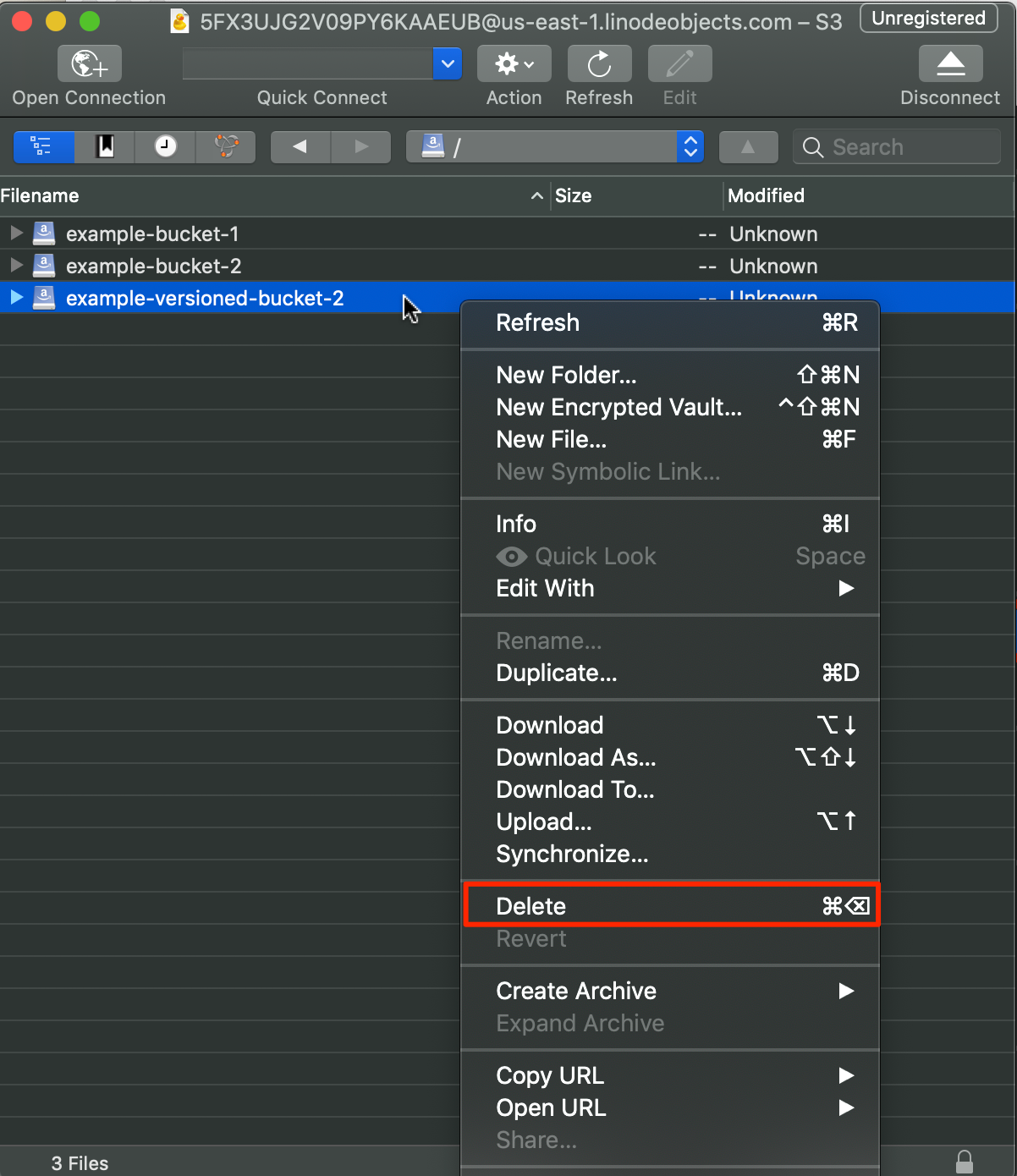You can use Cyberduck to manually delete an object and all of its versions that are stored in a bucket. The steps covered in this section are only useful if you have a few objects and a few corresponding versions in a bucket.