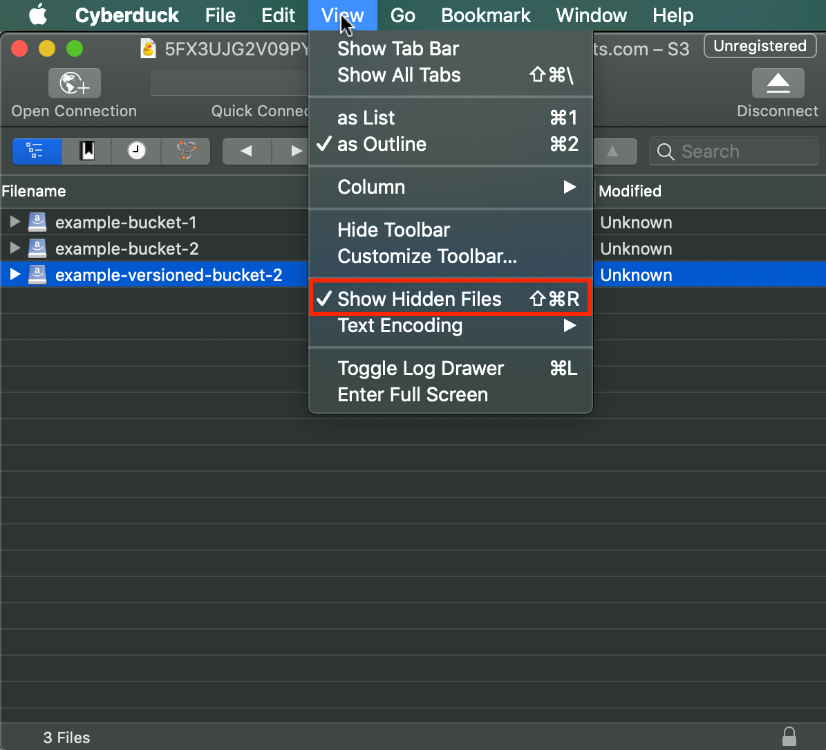 2. Viewing all of your bucket’s objects and their versions, ensure your bucket has Show Hidden Files enabled. In Cyberduck’s menu bar, click on View and select Show Hidden Files. A check will be displayed next to the option when it’s enabled.